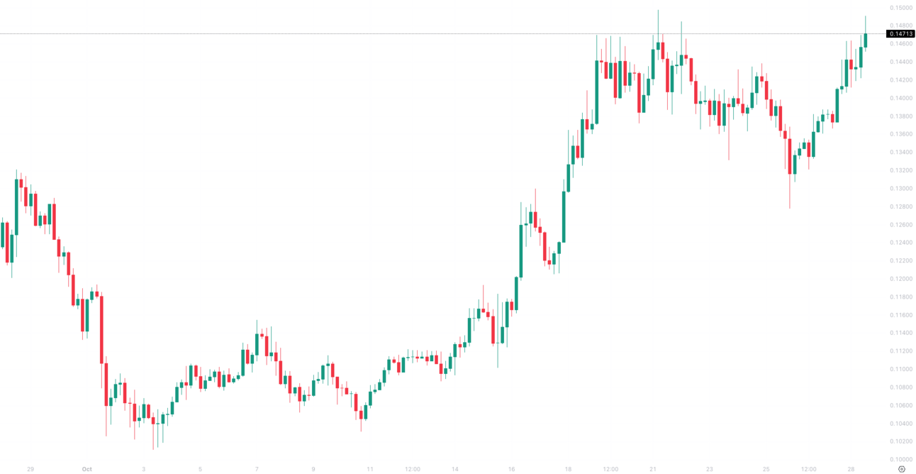 Sef de sector: Memecoin-ul care a popularizat acest intreg sector ia viata. DOGE atrage acum lichiditate si pare gata sa sparga o rezistenta importanta, care i-ar pute deschide drumul spre nivelul 0.2.