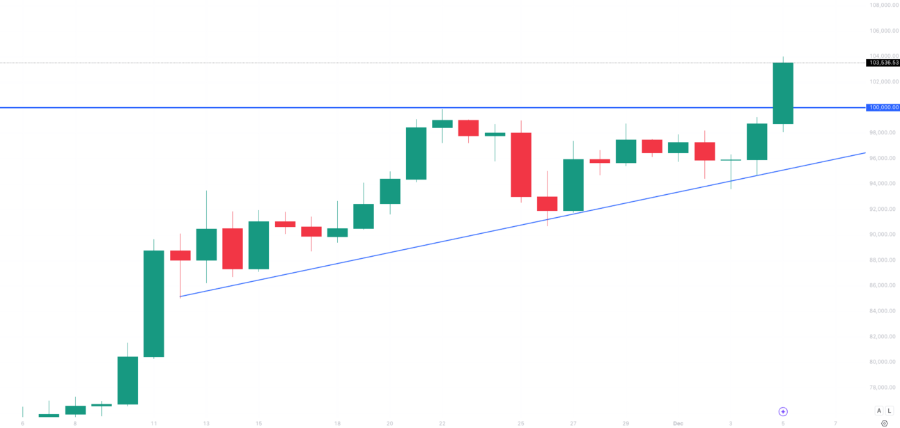 Acum acceleram: Bitcoin tocmai a trecut de pragul de $100.000, depasindu-l deja cu cateva mii. De aici, lucrurile devin mai usoare si cresterile mai sustinute. Rezultatul asta e datorat noua, celor care am crezut si am ramas in piata.