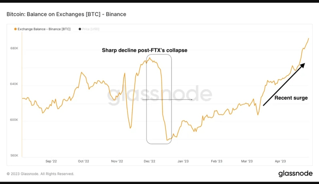 Si price action-ul ultimei luni se observa si in depozitele de BTC catre Binance. In decembrie am avut o scadere abrupta cauzata de frica starnita de FTX dar de atunci depozitele au inceput sa creasca. In ultimele 4 saptamani, totusi, acestea au accelerat si avem 692k Bitcoin pe Binance. De cele mai multe ori, aceste depozite inseamna ca urmeaza un selloff, so be ready.