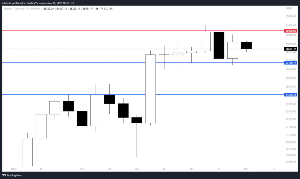 In acelasi timp, BTC pare sa fi avut un bearish retest al rezistentei de $30.000 pe timeframe weekly, in consens cu teza ca nu avem inca forta necesara sa o depasim. Practic, price action-ul care are loc intre $30.000 si $24.000 sta sub semnul intrebarii cu privire la posibile continuari. Atat timp cat nu intrecem niciuna dintre limite, nu avem o directie clara.