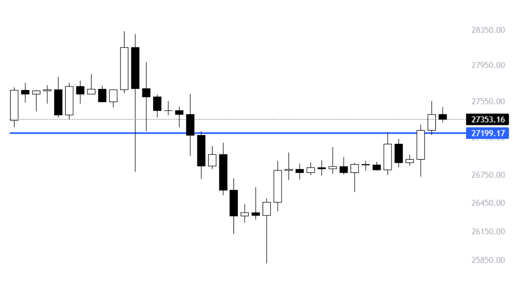 BTC a avut o saptamana interesanta in care a oscilat intre $28.300 si $25.800, ambele valori fiind atinse cu wicks destul de lungi. In niciuna dintre dati nu am avut volum convingator ca sa tragem concluzii solide despre puterea respingerilor, asadar ne aflam in continuare in no man’s land. Short term, ne aflam in partea de jos a range-ului $30.000 - $27.000 dar suportul de $27.000 nu s-a dovedit a fi foarte de incredere. Si daca adaugam faptul ca lichiditatea este foarte scazuta (vezi market update sneak peek), nivelurile pe care le avem trasate nu inseamna foarte mult.
