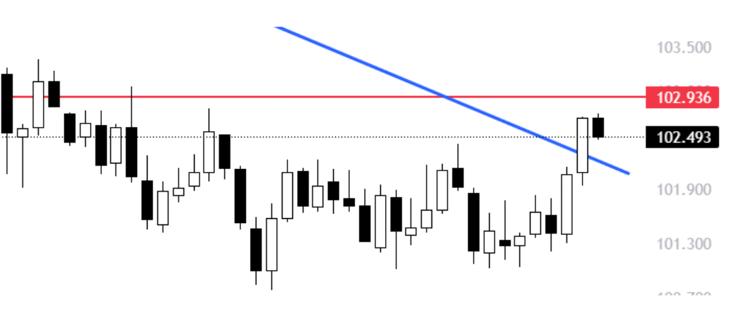 Dupa ce n-a reusit sa sparga 102.5 de la inceputul lui aprilie, DXY si-a facut curaj si a recapatat nivelul. Si, cu ocazia asta, a pus pauza raliului EUR care a suferit din cauza ultimelor date din Germania (mai exact, scaderi considerabile MoM in vanzari si nivelul de productie al fabricilor).