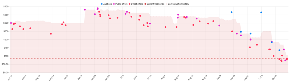 Intr-o situasimilara este si Ivan Toney, a carui suspendare de 8 luni se incheie in ianuarie 2024. Daca dupa verdict cardurile rare ale lui Toney se castigau la auction cu 164$, iar in bottom s-au vandut si sub 90$, acum un auction ajunge pana la 180$, in timp ce floor priceul e peste 250$.