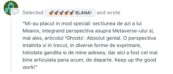 Mereu ne incalzeste sa citim feedback-ul vostru, el e cel care ne face sa continuam. Cheers!